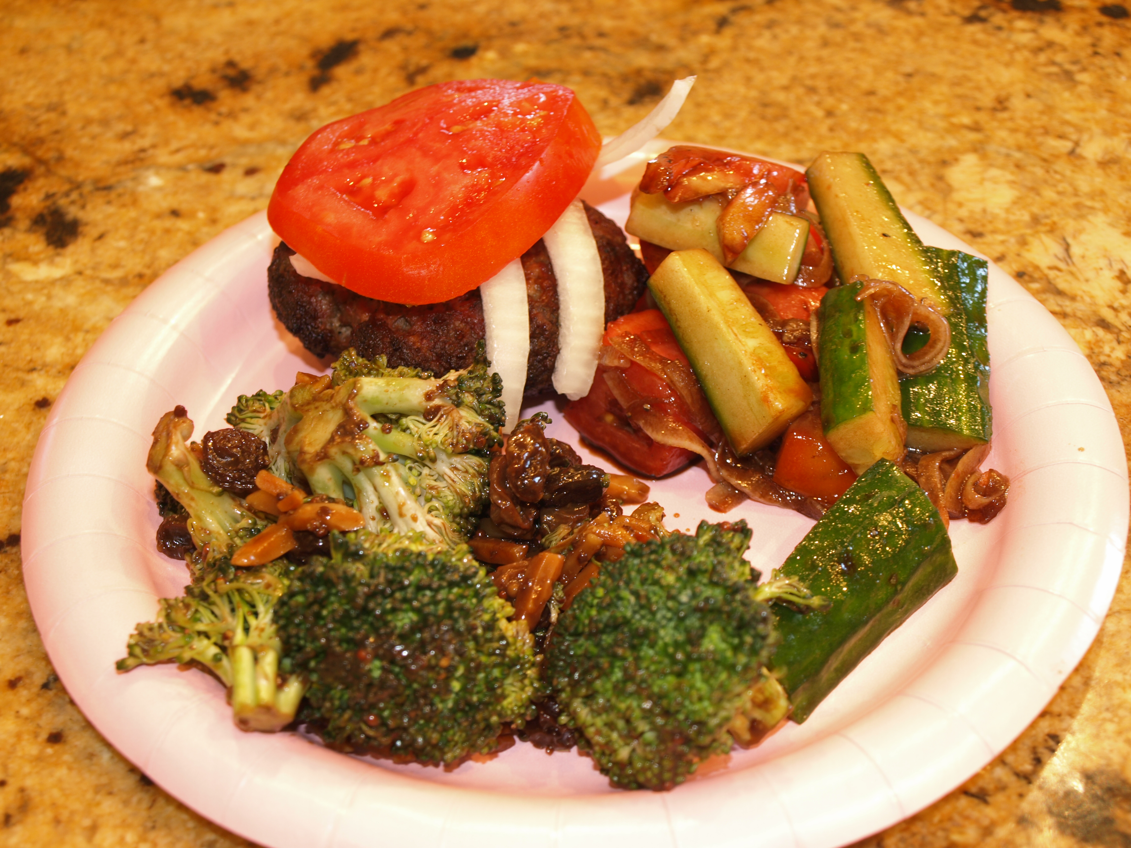 Fourth of July Lunch! Grassfed hamburger patties, Paleo Broccoli Salad, and a simple tomato cucumber salad with shaved red onions and balsamic vinegar.