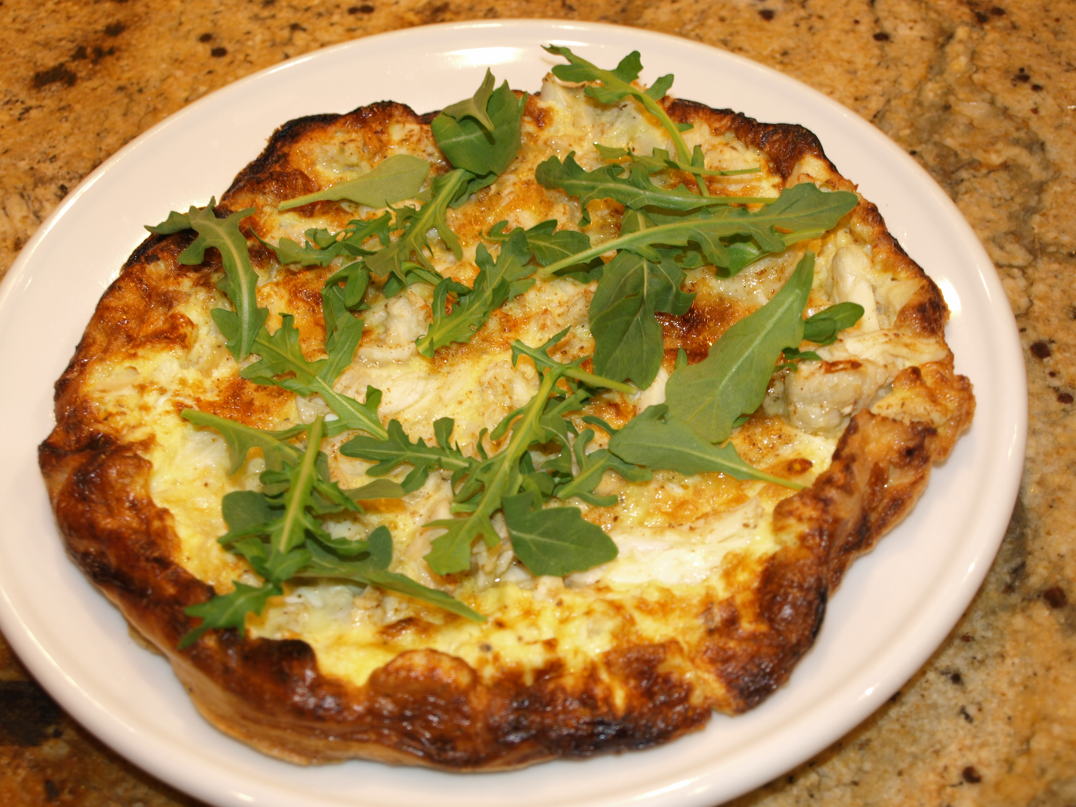 Lastly, here is my creation one night while hungry and at home alone. Lump crabmeat omelette! Three eggs tossed into a hot skillet well coated with ghee. As the eggs set a bit, sprinkle in the crabmeat. Transfer to a preheated broiler and cook until sides are puffy and brown, and the center is set. Top with some fresh arugula, and behold a masterpiece!