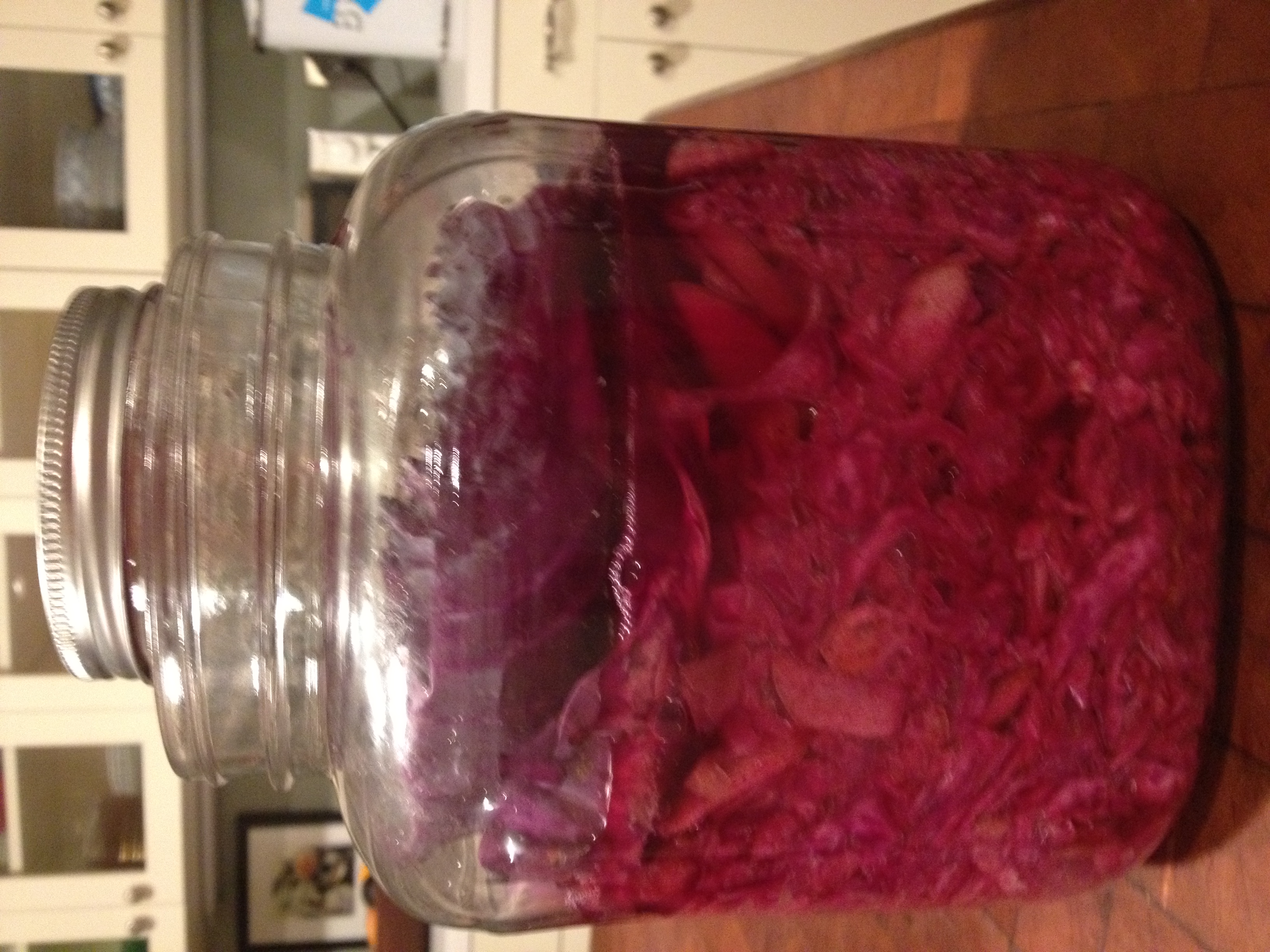 So, since starting a Paleo lifestyle last May, I became interested in non-dairy, or supplemental, sources of probiotics – for gut health – and discovered fermentation. Well, I didn’t “discover” it, but I’ve been experimenting with it – in the form of sauerkraut. Pretty good stuff. Above is my latest traditional-ish version. I used one head, each, green and purple cabbage, added celery seeds and caraway seeds, with ~3 tablespoons of kosher salt and let it work it’s magic for 3-4 weeks. I’ve got a new batch brewing as of a couple of days ago – purple cabbage, cranberries, apples, cinnamon, nutmeg, kosher salt – sauerkraut, my new dessert!!