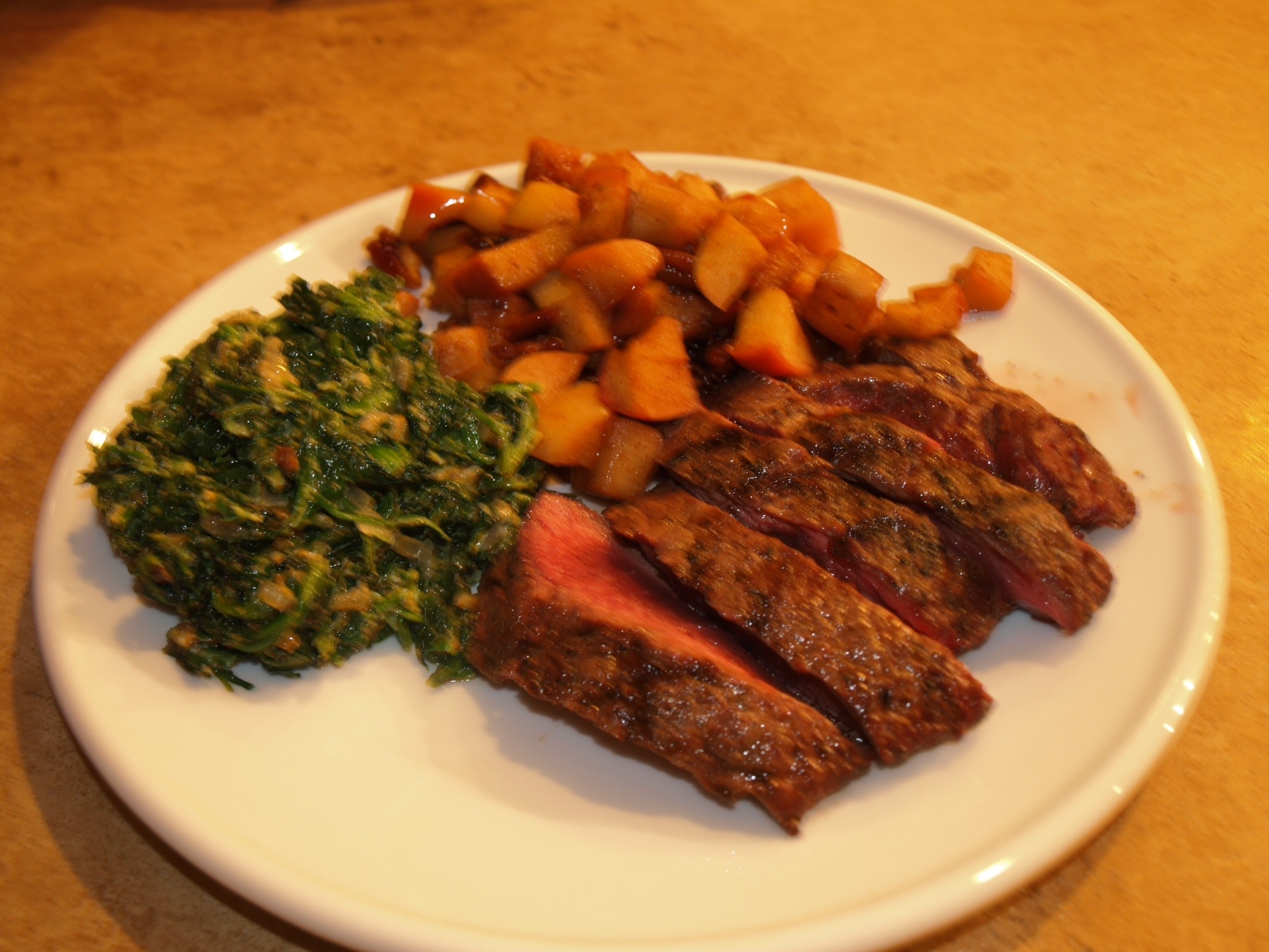 Saturday night I cooked up my kid’s favorite…Flat Iron Steak! They sell them individually pre-vacuum sealed at Kroger, and I find the flavor just about the best of any steak you can get anywhere. Like I said, the kids love it. Funny enough, they will ONLY eat it medium rare! I always cook it that way, and they won’t accept it any other way. Fine by me! I added another batch of the the Health-Bent.com Roasted Acorn Squash drizzled with a little of my newly made balsamic glaze, and a side of Inglewood Farms Chinese Spinach sautéed in bacon grease…YUM!