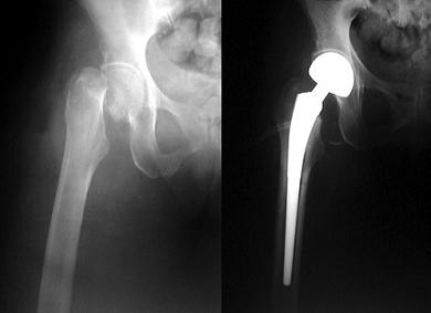 So what are we to do? The fact that there are 1.5 MILLION osteoporosis related fractures in the US every year makes this a massively important topic. Here is what a typical femoral neck fracture looks like before and after total hip replacement.