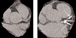 The picture on the left is a normal heart, notice the relative consistency in the density of the chambers and the vessels. On the right is a diseased heart with hardened arteries. Note first the size difference, diseased hearts tend to work harder, enlarging the muscles and making it less efficient. Also notice the white spots noted by the arrows; these are the coronary arteries that supply blood flow to the heart itself. When you have a heart attack, it is these arteries that are affected.