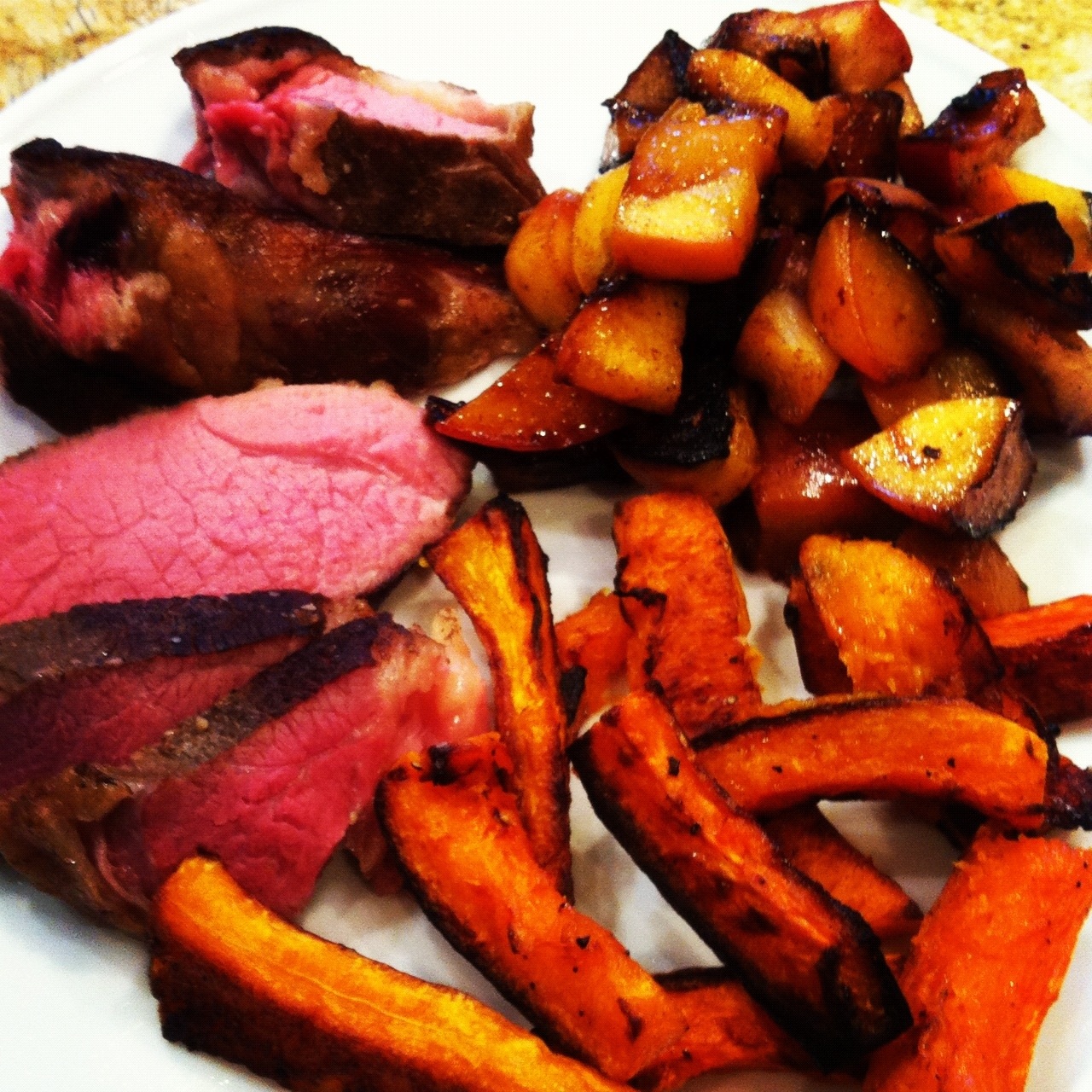 Today I pulled out the Grassfed Chuck Roast I put in the Sous Vide right after pulling the pork out. I put it in at 130 F for 48 hours. Here are the picture start to finish for the meat and sides. First the chuck roast, then the roasted butternut squash “fries”, and some sautéed peaches and apples with cinnamon and ghee. YUM!